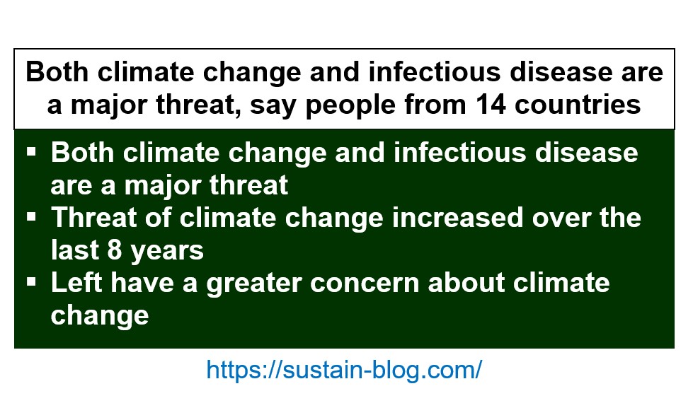 People from 14 countries from 4 continents say that both global climate change and the spread of infectious disease are a major threat to their own countries, as revealed by the Pew Research Center in October 2020.