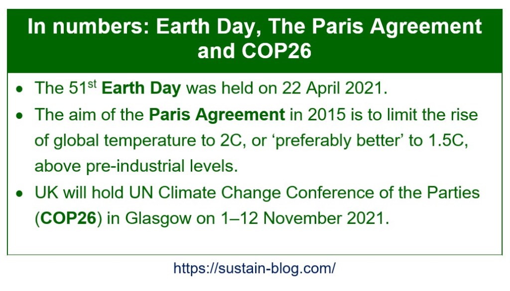 Today, five days have passed the Earth Day 2021 as well as Joe Biden’s Leaders Summit on Climate. Now the Paris agreement 2015 is on the focus. The next stop is COP26, scheduled to be held in Glasgow in November 2021.