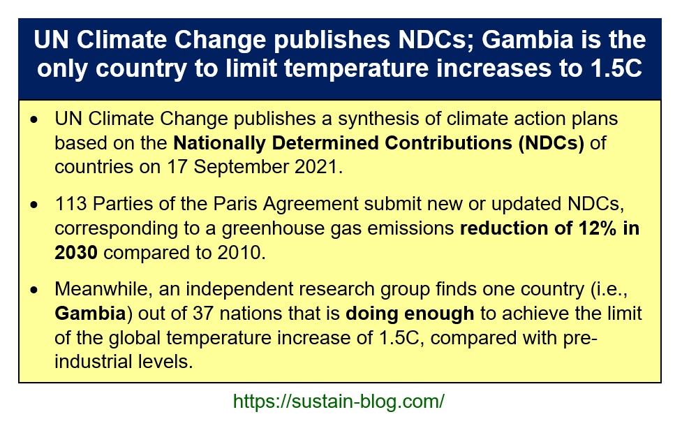 A synthesis of climate action plans based on the Nationally Determined Contributions (NDCs) of countries is published by the UN Climate Change on 17 September 2021. Meanwhile, the independent research group Climate Action Tracker finds just one country (i.e., Gambia) out of 37 nations of the Paris Agreement that is doing enough to achieve the limit of the global temperature increase of 1.5C, compared with pre-industrial levels.