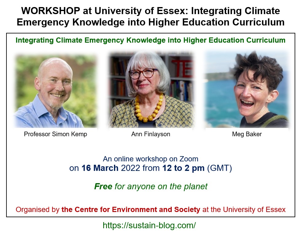 Three guest speakers from the UK will talk at an online Zoom workshop on Integrating Climate Emergency Knowledge into Higher Education Curriculum on 16 March 2022 from 12 to 2 pm (GMT).