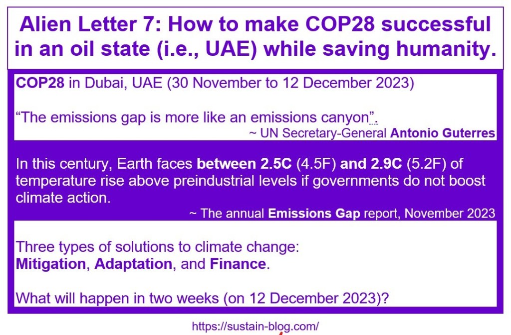 On the 1st of January 2016, I wrote my first letter to the UN Secretary-General on the Paris Agreement signed in 2015. This letter is my seventh and, this time, you – as the COP28 President – are the recipient of this alien letter.